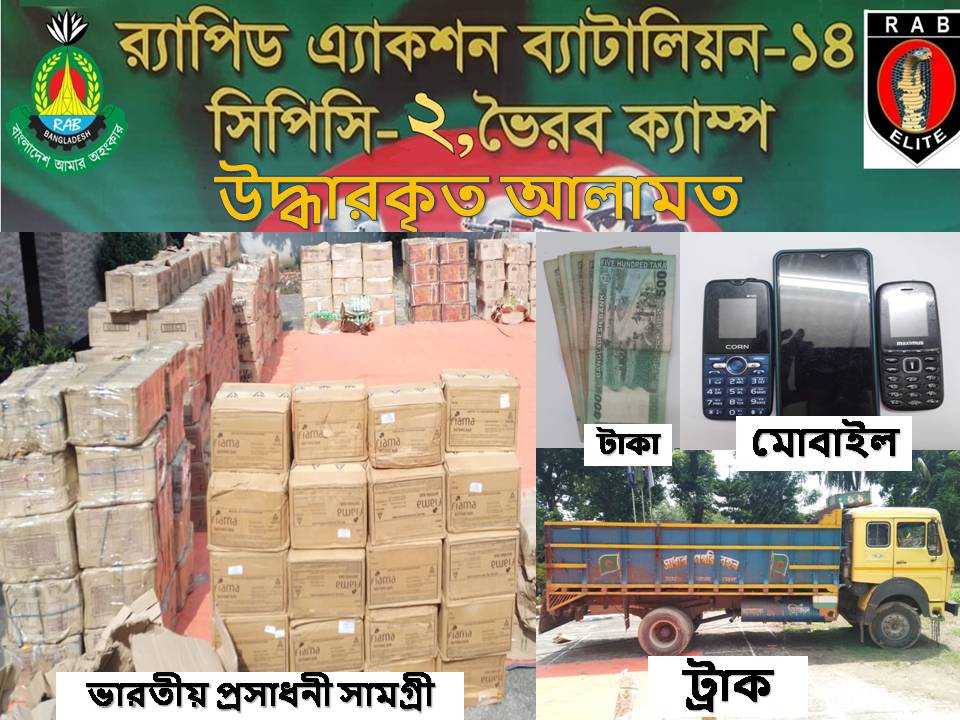 ভৈরবে বিপুল পরিমান ভারতীয় প্রসাধনী জব্দ ২ চোরা কারবারি আটক