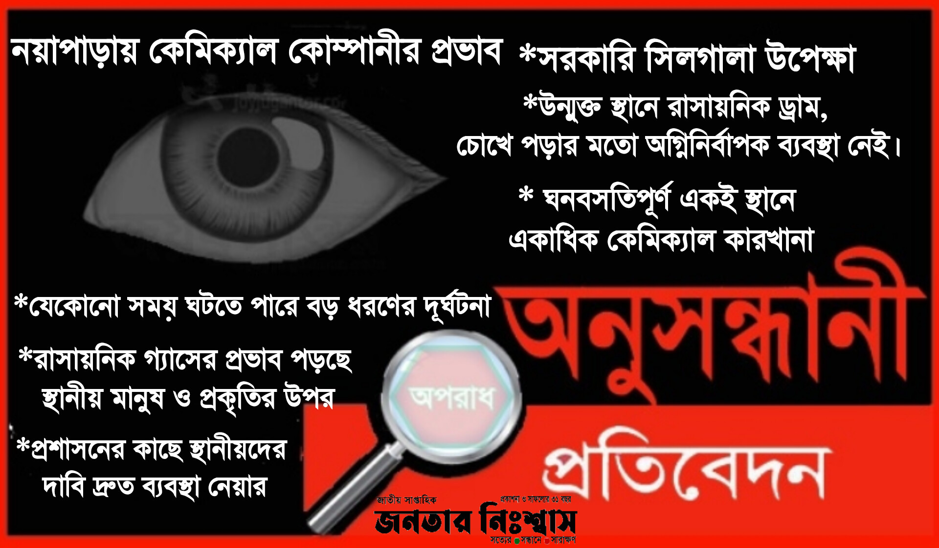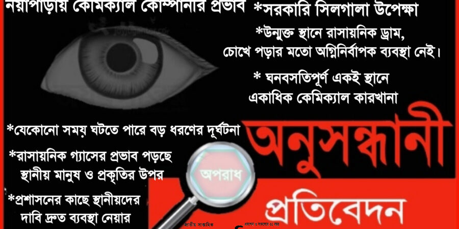 জনতার নিঃশ্বাস প্রতিবেদন:: পরিবেশ সংরক্ষণ আইন, ১৯৯৫ অনুযায়ী আবাসিক এলাকায় কেমিক্যাল কারখানা, গুদাম পরিচালনার কোন সুযোগ না থাকলেও গাজীপুর সদর উপজেলার নয়াপাড়া গ্রামে চলছে কেমিটেক্স ও কেমিকন নামে দুটি কারখানা। ২০২২ সালে ভ্রাম্যমাণ আদালত পরিচালনা করে উপজেলা প্রশাসন কেমিটেক্স কারখানাটি সিলগালা করে দিলেও পরবর্তীতে পাশেই নিজস্ব ভবনে চলছে এই কারখানা। কেমিক্যাল কারখানা, গুদাম পরিচালনার ক্ষেত্রে পরিবেশ অধিদপ্তর, জেলা প্রশাসন, বিস্ফোরক অধিদপ্তর, ফায়ার সার্ভিস, স্থানীয় ইউনিয়ন পরিষদের ছাড়পত্র বা লাইসেন্স গ্রহণের বিধান রয়েছে। তবে সূত্রমতে পর্যাপ্ত কাগজপত্র নেই এসব কারখানার। সূত্র আরো নিশ্চিত করেছেন পরিবেশ অধিদপ্তরের তৎকালীন উপ-পরিচালক নয়ন মিয়া মোটা অংকের টাকার বিনিময়ে এসব ক্ষতিকারক বিপদজনক রাসায়নিক কারখানা ও গোদামের অনুমোদন দিয়েছেন। কেমিকন কারখানা কর্তৃপক্ষ ফেব্রুয়ারি মাস পর্যন্ত তাদের পরিবেশের ছাড়পত্র থাকার কথা বললেও এলাকাবাসীর দাবি তাদের যাতে এমন ঘনবসতিপূর্ণ স্থানে আবার ছাড়পত্র দেয়া না হয়। এর ঠিক পাশেই খোলা স্থানে যত্রতত্র রাখা হচ্ছে কেমিকেল তৈরির উপাদান ও পাশেই অনিরাপদ গোডাউন। ঘনবসতিপূর্ণ স্থান হওয়ায় এবার এই কেমিকেল কারখানা ও গোডাউন বন্ধের দাবি তুলেছেন স্থানীয়রা। “নয়াপাড়ায় অবৈধ কেমিক্যাল কোম্পানী ও রাসায়নিক গোদাম: স্থানীয়দের শরীর জ্বালা পোড়াসহ বিভিন্ন রোগের উপস্থিতি” শিরোনামে সাপ্তাহিক জনতার নিঃশ্বাস পত্রিকায় সংবাদ প্রকাশের পর ২০২২ সালের ১৯ অক্টোবর সেই কেমিক্যাল কোম্পানীটিতে গাজীপুর সদর উপজেলা ভূমি কর্মকর্তা ও নির্বাহী ম্যাজিস্ট্রেট রাফে মোহাম্মদ ছড়া’র নেতৃত্বে ভ্রাম্যমাণ আদালত পরিচালনা করা হয়েছিলো।সেসময় পরিবেশ সংরক্ষণ আইন ১৯৯৫ এর ১২ নম্বর ধারা অনুসারে ১ লক্ষ টাকা জরিমানা অনাদায়ে ৩ মাসের জেল দেয়া হয় সেই সাথে পরিবেশ ছাড়পত্র না নেয়া পর্যন্ত কোম্পানীটি সিলগালা করা হয়েছে। কিন্তু এর কিছু দিন পরই ভাড়া ভবন ছেড়ে পাশেই নিজস্ব ভবনের মধ্যে তাদের কার্যক্রম চালানো হচ্ছে প্রকাশ্যেই। কেমিটেক্স নামে সেই কোম্পানীটির পরিবেশ ছাড়পত্র না থাকলেও ঘনবসতিপূর্ণ স্থানে তারা কেমিক্যাল দিয়ে পণ্য বানাচ্ছে। যদিও কারখানা কর্তৃপক্ষের দাবি পরিবেশ ছাড়পত্র নিয়েছে। অপরদিকে বনের জমি দখল করে তৈরি করেছে বিশাল আকৃতির অরক্ষিত রাসায়নিক বর্জ্য ফেলার গর্ত। অন্যদিকে এর পাশেই আরেকটি কেমিক্যাল কোম্পানী কেমিকন,মালিক পক্ষের দাবি তাদের কিছু কাগজপত্র রয়েছে কিন্তু বিশ্বস্ত সূত্রের দাবি তাদের পর্যাপ্ত কাগজ পত্র নেই। অন্যদিকে কেমিকন কারখানাটির পাশেই উন্মুক্ত স্থানে তাদের কেমিক্যাল ভর্তি ড্রাম রাখছেন