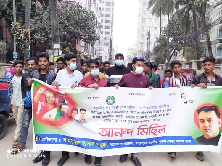 ময়মনসিংহ সিটি কর্পোরেশনের উন্নয়নে ১৫৭৫ কোটি টাকার প্রকল্প একনেক সভায় অনুমোদিত হওয়ায় সিটি কর্পোরেশনের প্যানেল মেয়র, কাউন্সিলর বৃন্দ, কর্মকর্তা-কর্মচারীবৃন্দ, সহ ৩৩ টি ওয়ার্ডের নেতাকর্মীদের আনন্দ মিছিল ও মিষ্টি বিতরণ |