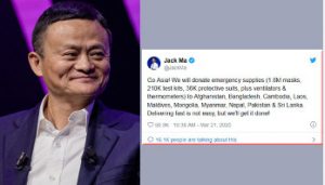 টুইট বার্তায় জ্যাক মা লিখেছেন, তারা ১৮ লাখ মাস্ক, দুই লাখ ১০ হাজার টেস্ট কিট, ৩৬ হাজার নিরাপত্তামূলক পোশাক দেবেন।  সেই সঙ্গে ভেন্টিলেটর এবং থার্মোমিটারও দেওয়া হবে।