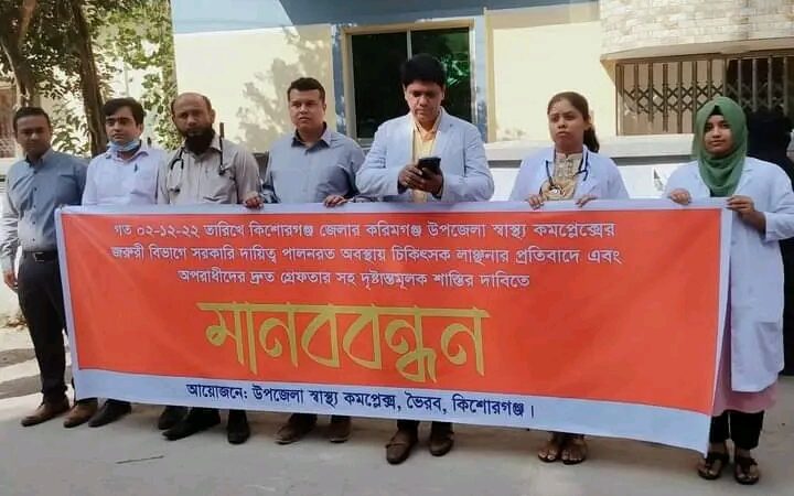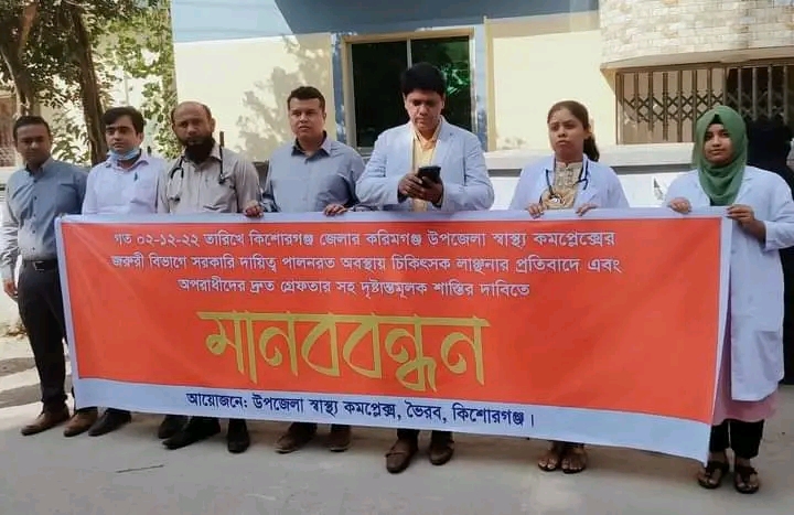 চিকিৎসকের উপর হামলা,হত্যা চেষ্টার ঘটনায় আসামিদের গ্রেফতারের দাবিতে ভৈরবে উপজেলা স্বাস্থ্য কমপ্লেক্সের কর্মরত চিকিৎসক,নার্স ,কর্মকর্তা-কর্মচারীরা ঘন্টাব্যাপী মানববন্ধর কর্মসূচী পালন করেছে । জানাযায় গত ২ ডিসেম্বর কিশোরগঞ্জের করিমগঞ্জ উপজেলা স্বাস্থ্য কমপ্লেক্সে জরুরী বিভাগে দায়িত্বপালনে হাসপাতাল সংলগ্ন পাশের বাড়িতে ফিরোজা বেগম নামে এক রোগীকে বাড়িতে গিয়ে চিকিৎসার জন্য চাপ দেন রোগীর স্বজন রিয়াজ ও মামুন সহ কয়েকজন । এ সময় জরুরী বিভাগের দায়িত্ব পালনকালে অন্য কোথাও যেয়ে চিকিৎসা সেবা দিতে অপরগতা জানালে কিছুক্ষণ পর রোগীর স্বজনরা রোগীকে জরুরী বিভাগে নিয়ে এলে পরীক্ষা-নিরীক্ষা শেসে রোগী মারা গেছে বলে জানালে রোগীর স্বজন রিয়াজ,মামুনসহ আরো অঞ্জাতনামা ৪/৫ জন চিকিৎসক ডাঃ মোঃ কামরুল হাসান ওয়াসিম এর উপর হামলা চালায়। এ সময় তার ডাক চিৎকারে অন্যান্য সহকর্মীরা এগিয়ে এসে তাকে রক্ষা করেন । এ ঘটনায় মামলা দায়ের করা হয় ।