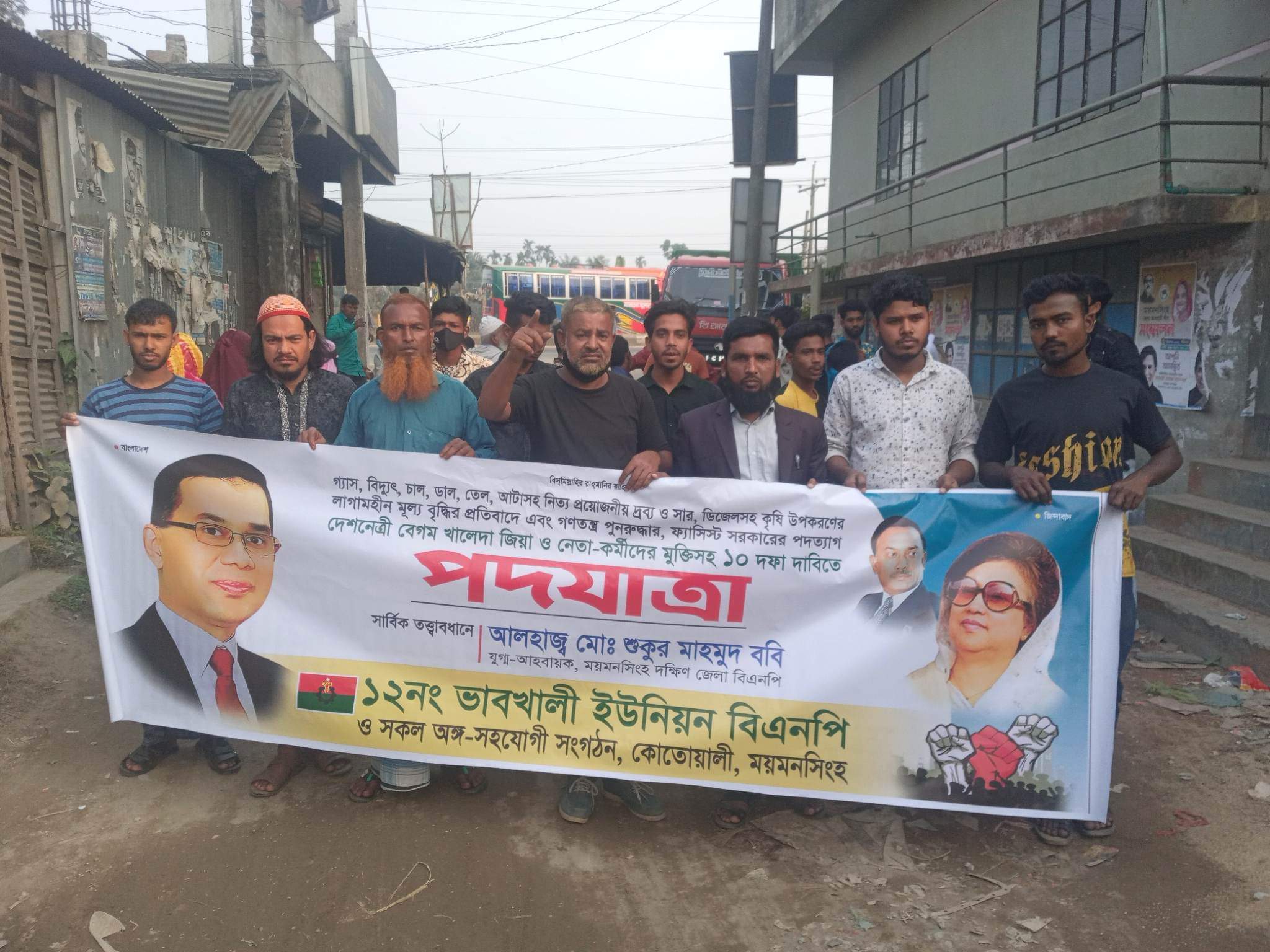 কেন্দ্রীয় বিএনপির কর্মসূচির অংশ হিসেবে ময়মনসিংহের ১২নং ভাবখালী ইউনিয়নের বিএনপি,ছাত্রদল ও অঙ্গ সংগঠনের নেতাকর্মীরা বেগম খালেদা জিয়ার নিঃশর্ত মুক্তি, নির্বাচনকালীন তত্ত্বাবধায়ক সরকার, জ্বালানি তেল, ডালসহ নিত্যপ্রয়োজনীয় দ্রব্যের ঊর্ধ্বগতি, ও সন্ত্রাসীদের গুলিতে হত্যা, হামলা ও মিথ্যা মামলাসহ ১০ দফা বাস্তবায়নের দাবিতে পদযাত্রা ও সমাবেশ করেছে।